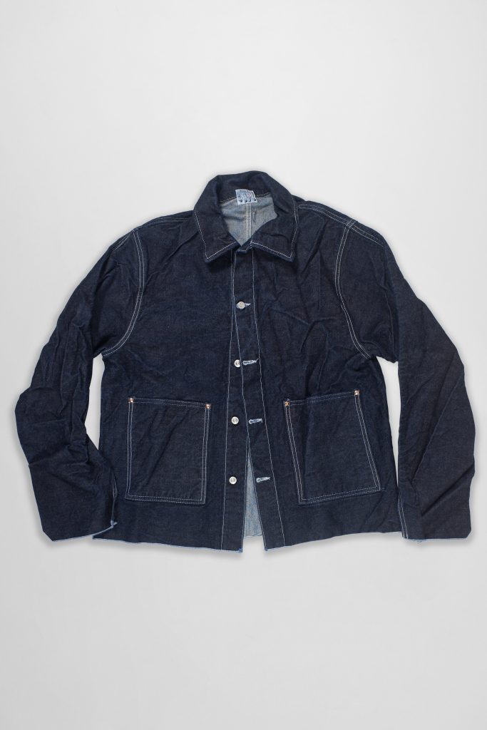 This jacket follows the season’s experiments with cross cutting: the pattern is laid sideways across the denim fabric, which governs the length of the body and sleeves, which both finish with horizontal selvage lines. The body is cut from a single piece of fabric, and the sleeves are fasted along the tops, up to the shoulder seams. Four patch pockets are fastened to the fronts and back of the jacket, and the collar is a fully shaped two-piece construction. Sewn with all-cotton thread and finished with riveted jeans fly buttons. Made in UK red label.