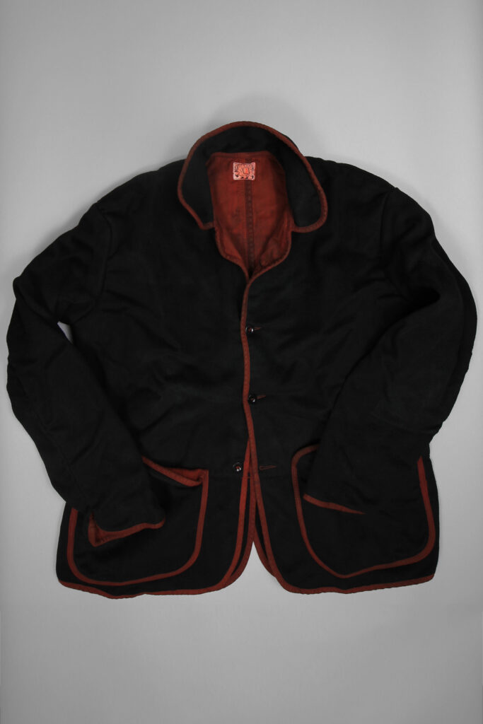 The panels for Lobster Tail Jackets are all individually lined and bias-bound, before assembling with flat lapped seams. Because bias binding can not be used to edge sharp corners, all the panels are rounded. As rounded tails can not be sewn together into a flat edge, the four tails of the jacket have a distinctive scalloped shape, like a lobster’s tail.