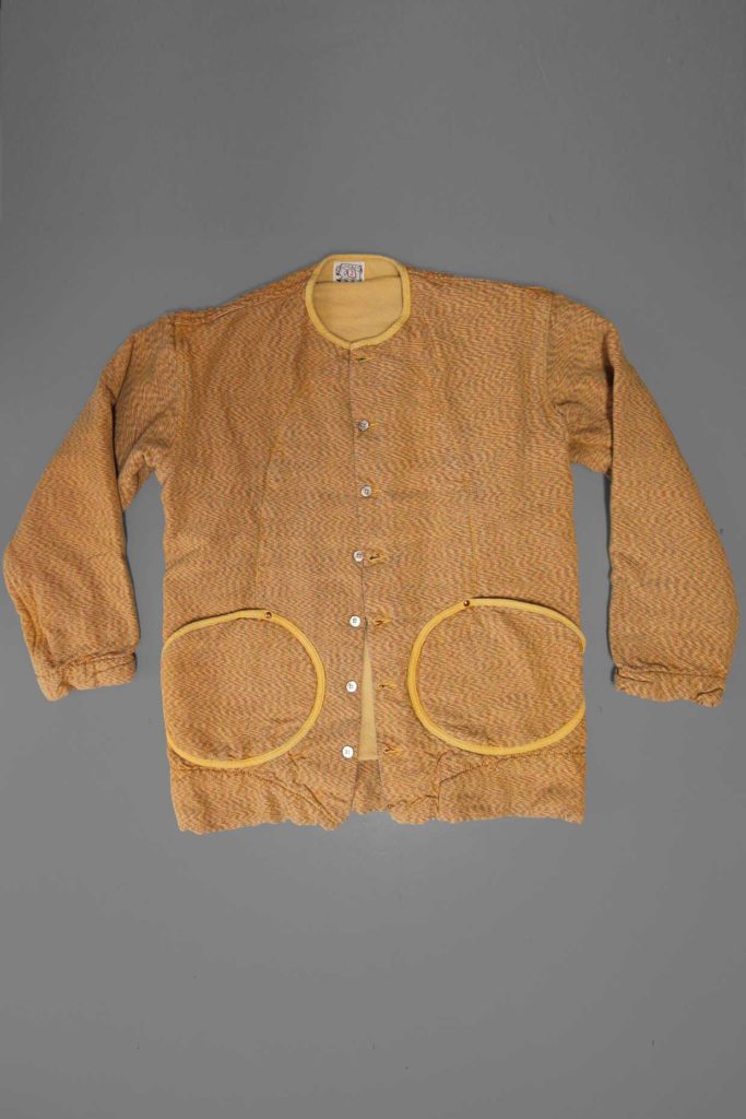 The Lined Folded Morning Coat is collarless, based on 18th Century frock coats. The fronts and hem are cut round, like a tail coat, and then folded back to created a straight placket and seat. The front, neck, and hem are all bound in one run, with custom- made cotton bias binding, and the whole coat is fully lined with woollen blanket cloth, cut loomstate so that it is shrunk with the outer cloth during dyeing or washing.