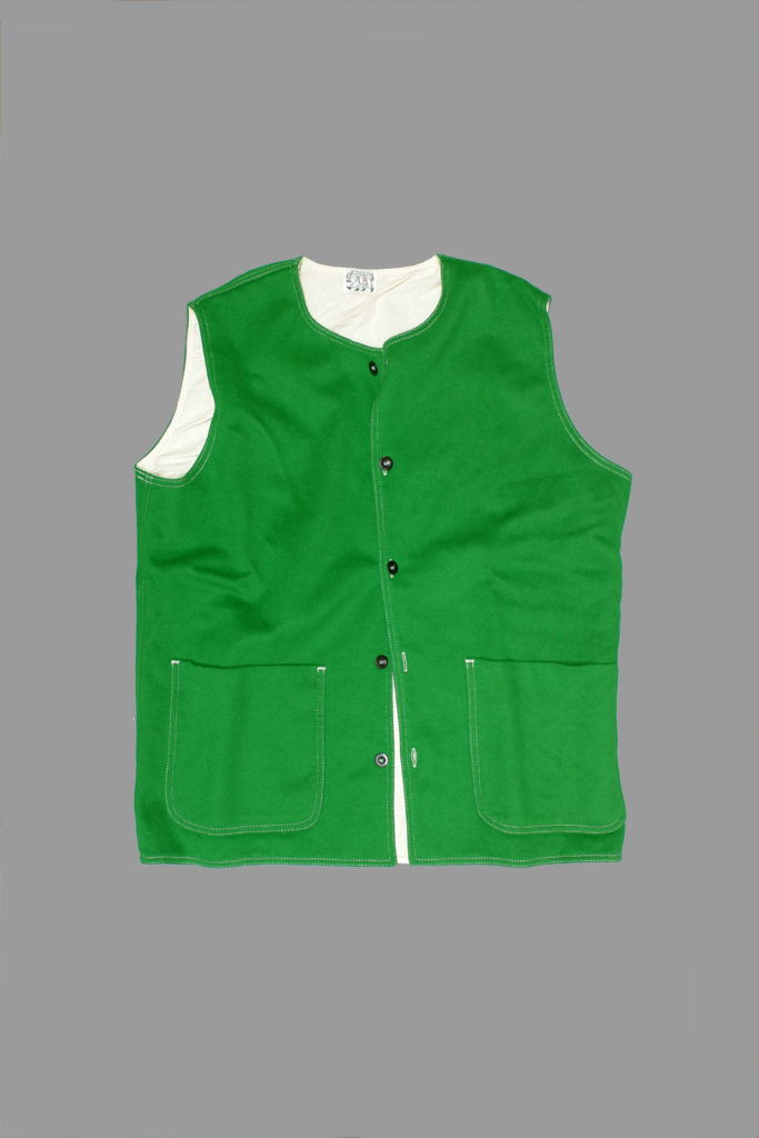 The Weaver’s Stock Collarless Vest is unstructured and simply shaped, with narrowed shoulders and a lowered neck to wear comfortably over over shirts or knitwear. The body and pockets are fully lined with fine upholstery calico.