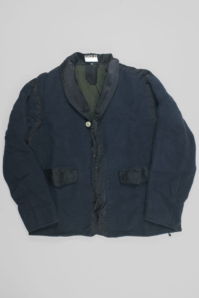 The applied panels create the warmth of three layers in the coat without adding bulk to the seams. The wool panels edges are left raw and fray out over the nylon panels, showing the construction and fabric textures.