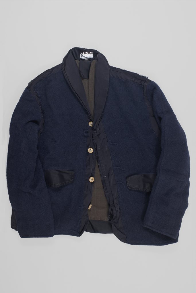 The applied panels create the warmth of three layers in the coat without adding bulk to the seams. The wool panels edges are left raw and fray out over the nylon panels, showing the construction and fabric textures.