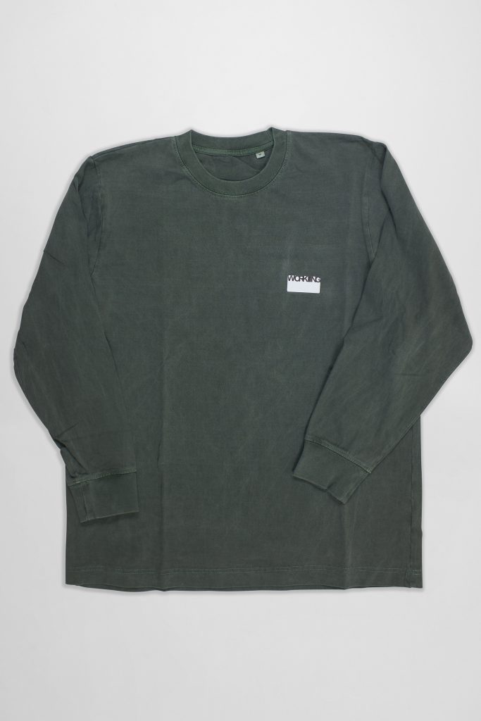 Pigment dyed heavyweight tee in organic cotton, with washable heat-pressed ’sticker’ Working branding at the chest.