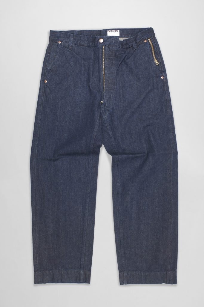 The full rise fly references bondage trousers, gives a cleaner front, and is a novel solution to the fly end debate waged through manufacturers patents in the late 19th Century. The left zipped side pocket pocket bag fits in behind the main side pocket, while the flapped right side pocket bag faces backwards. The tapered fit, deep hems and curved vertical front pockets recall casual men’s slacks, which give these jeans their name.
