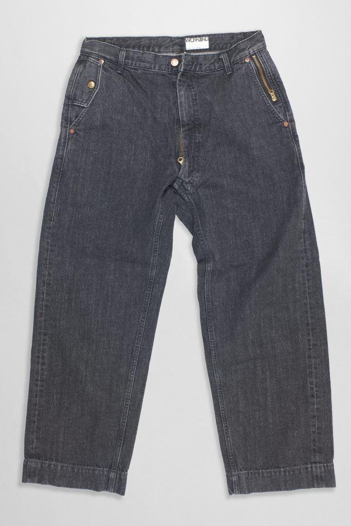The full rise fly references bondage trousers, gives a cleaner front, and is a novel solution to the fly end debate waged through manufacturers patents in the late 19th Century. The left zipped side pocket pocket bag fits in behind the main side pocket, while the flapped right side pocket bag faces backwards. The tapered fit, deep hems and curved vertical front pockets recall casual men’s slacks, which give these jeans their name.