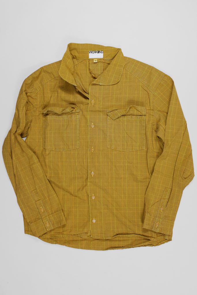 Split trapezoidal shoulder yokes and symmetrical flapped chest pockets. Standless collar combines elements of camp, penny, funnel, club, mandarin, stub, and shawl collars.