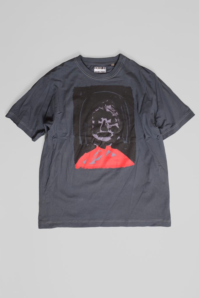 Screen printed and home dyed tee in organic cotton. The first screen, for the background of the face, was used uncoated or exposed, and the shape was pushed through it by hand on the printing table. The second and third screens, Jason’s painting, were then printed over the top of the background colour,.