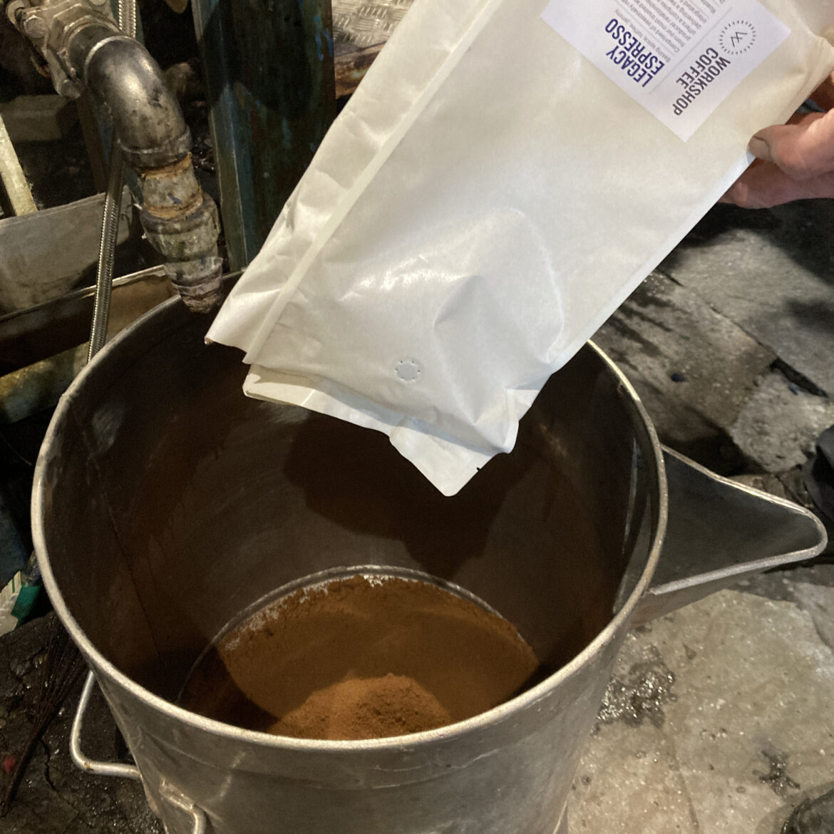 James Bailey of Workshop Coffee, emailed me last year asking if I was interested in experimenting with the spoiled coffee beans that would otherwise be wasted during their exacting roasting process. I worked with my dyer over several months to try to work something out, and James and his team provided various different options, at different finenesses, as very concentrated liquids, and at different darknesses, until we got to a workable combination. This has been a lovely collaboration, as I’m a big fan of coffee but know little about the roasting process, and I believe it’s fair to say that James is vice versa a lover of clothes but had little knowledge about dyeing processes. By working together with an openness to what might come out at the end of it we built a truly rewarding collaboration starting with a pair of socks but leading to a full dye lot of clothing.