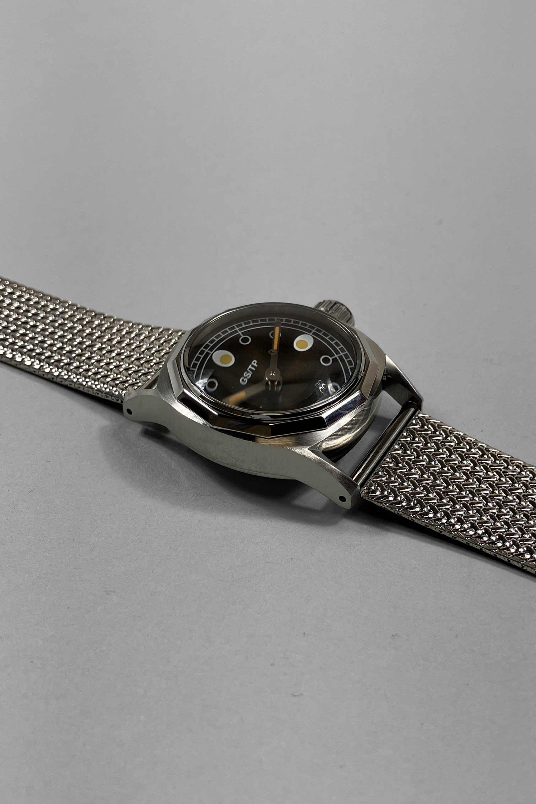 The custom-milled surgical steel case is quad-screwed with a bubble back, finished with linear brushing on the sides, radial brushing on the back, and mirror polishing on the thruppenny bezel, inspired by a British ‘thruppenny bit’ (three pence coin), which was dodecagonal from 1936 until its withdrawal in 1971. The twelve points of the bezel line up with the hour indices.