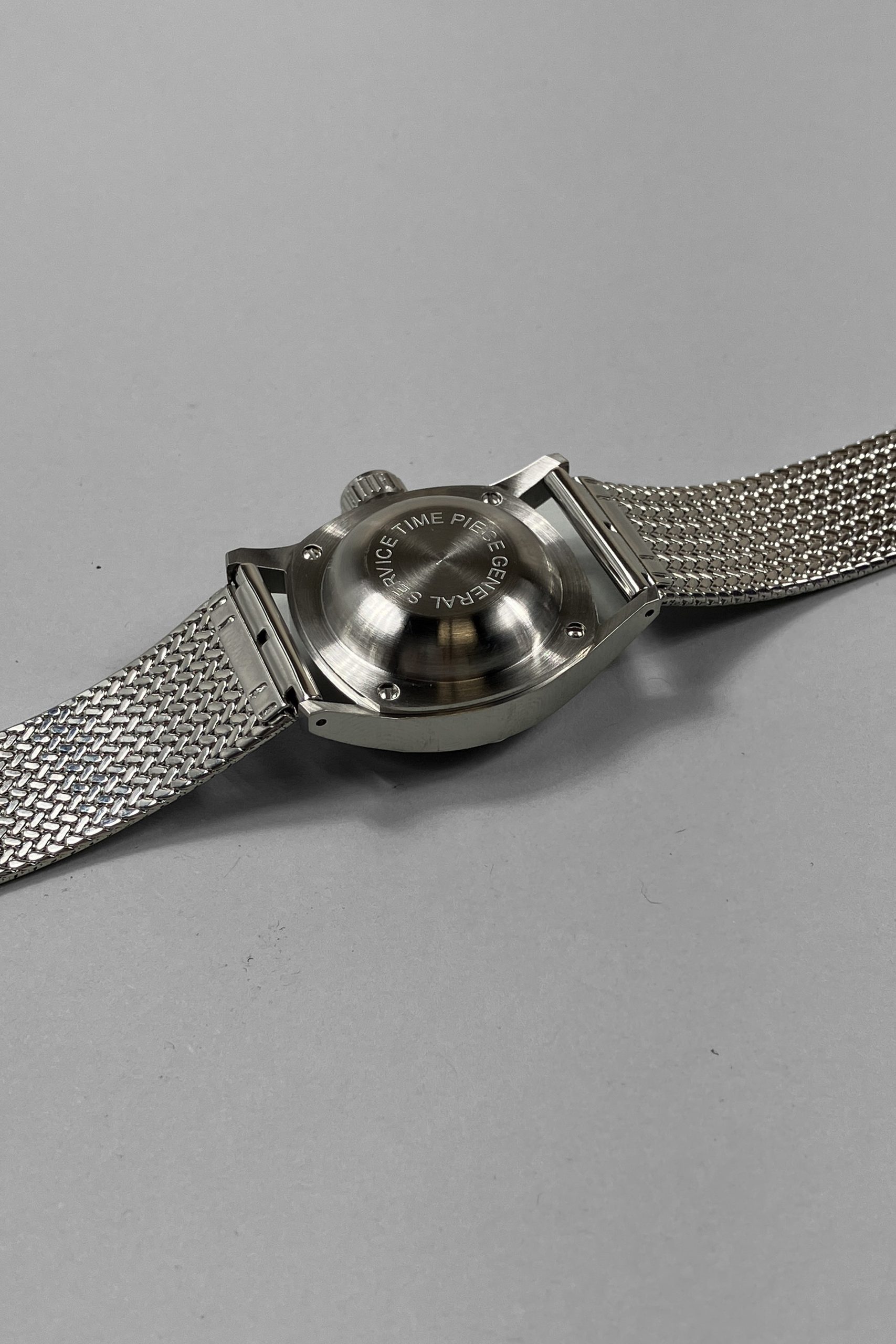 The gently twisted bombe lugs are half drilled- the lug holes on the crown side are only semi drilled, while the lugs on the left side are fully drilled. This anachronistic detail, taken from some early Rolex models, combines the convenience of fully drilled lugs with a slightly cleaner profile on the crown side of the watch.
