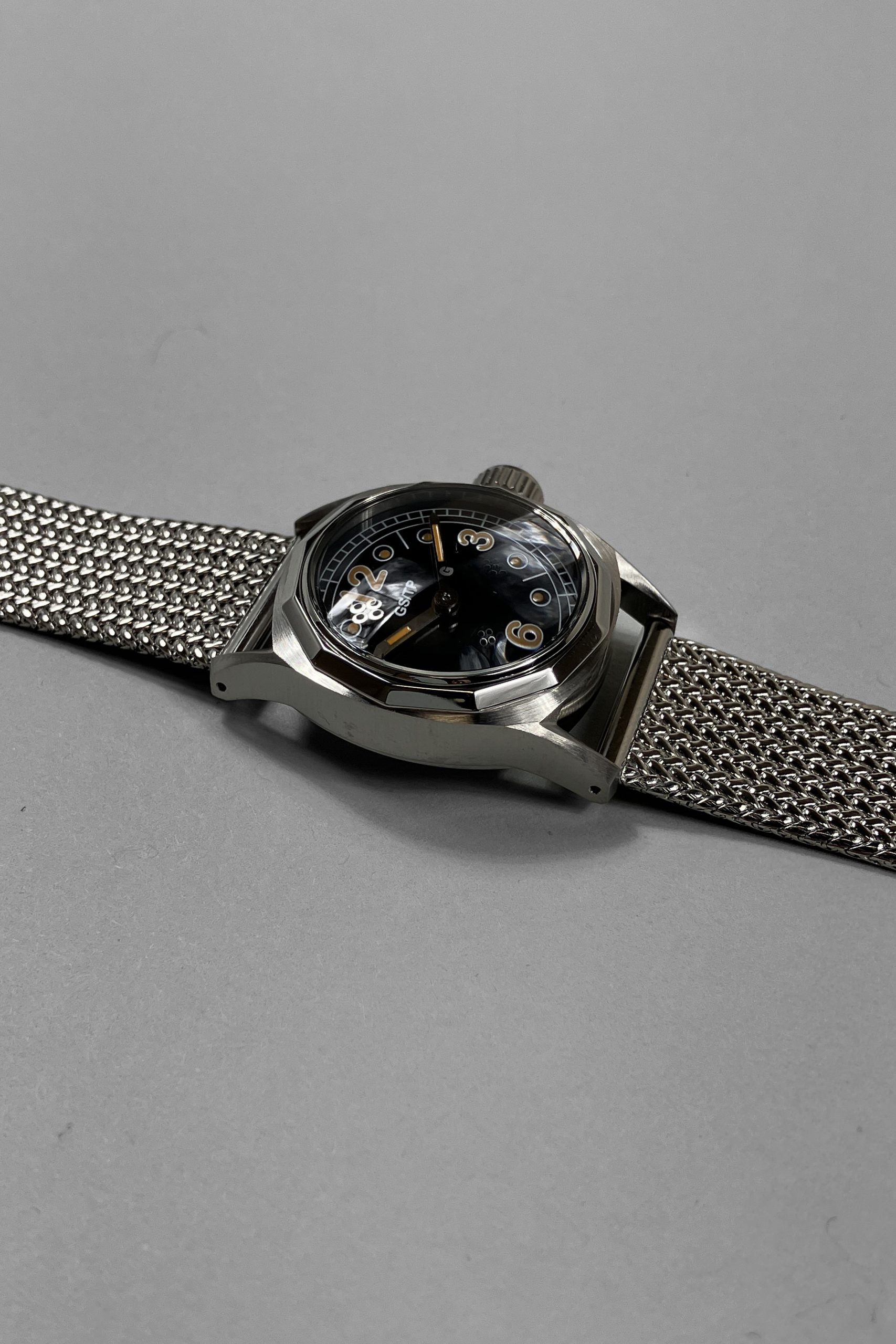 The gently twisted bombe lugs are half drilled- the lug holes on the crown side are only semi drilled, while the lugs on the left side are fully drilled. This anachronistic detail, taken from some early Rolex models, combines the convenience of fully drilled lugs with a slightly cleaner profile on the crown side of the watch.