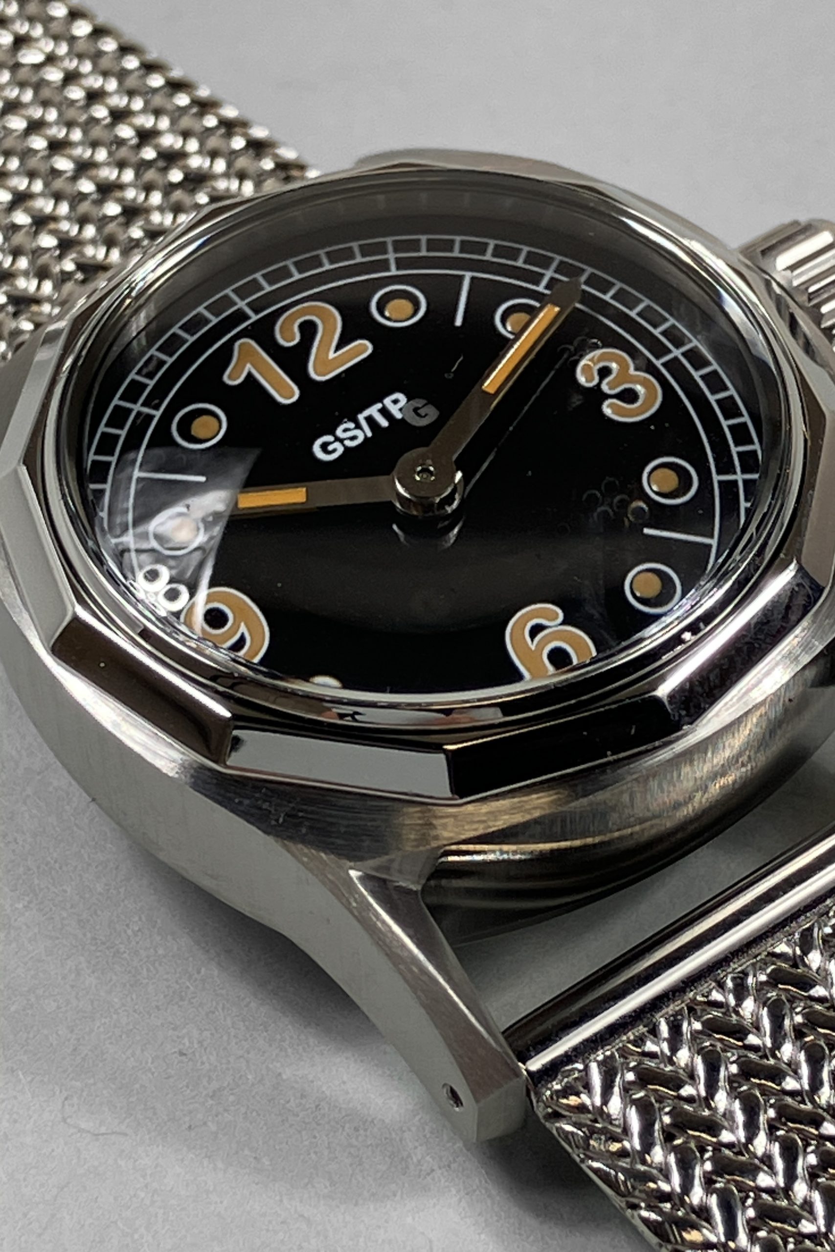 The custom-milled surgical steel case is quad-screwed with a bubble back, finished with linear brushing on the sides, radial brushing on the back, and mirror polishing on the thruppenny bezel, inspired by a British ‘thruppenny bit’ (three pence coin), which was dodecagonal from 1936 until its withdrawal in 1971. The twelve points of the bezel line up with the hour indices.