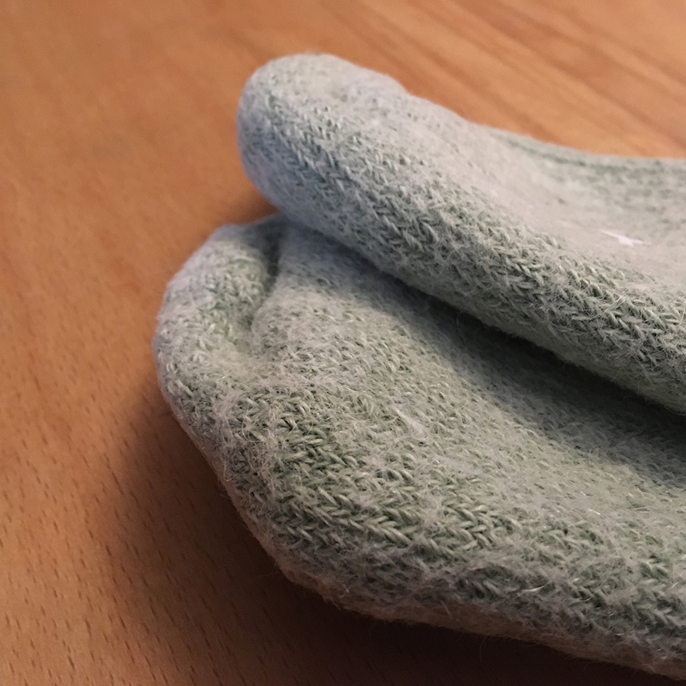 Traditional hosiery (like these socks) is knitted as a long continuous tube of many socks, which are then cut apart into individual socks. These are then linked, which means that the open sock has the two sides knitted together, leaving a flat, seamless, join at the toe. Linking requires the operator to loop every corresponding stitch of the top and bottom of the sock, by hand, onto a knitting machine.