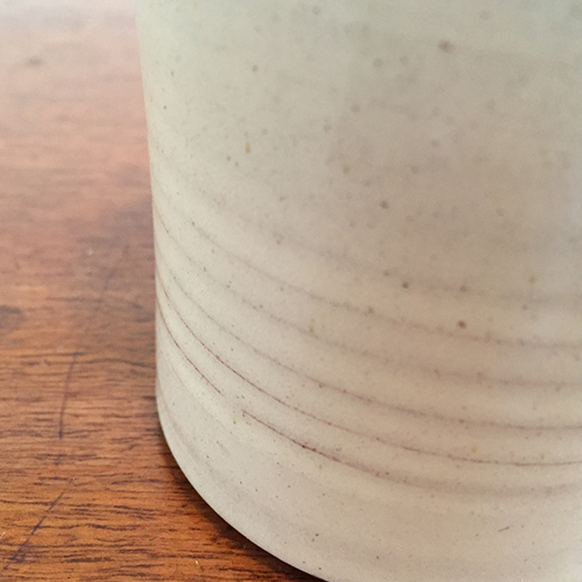 Tender’s tea beaker is hand thrown in England from natural red clay dug in England. It is slipped with natural white English clay, and left unslipped and unglazed on the base, to reveal the original character of the mud. The white slip is glazed with coloured metal salts.