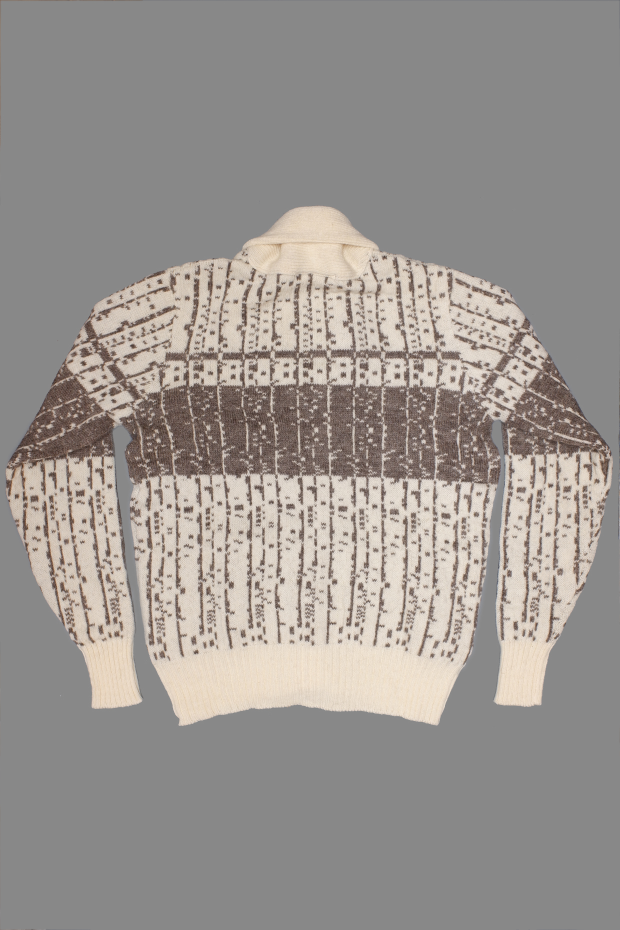 These cardigans are the melodies of three tracks from the Monk’s Dream LP (1952) by The Thelonious Monk Quartet, and three from J S Bach’s Goldberg Variations as recorded in 1955 by Glenn Gould, converted into three knitting patterns. Each pattern is a combination of a track from each LP, switching between the two whenever the music meets at a common note. The cardigans are made up in Scotland as a traditional Fair Isle, using dyed lambswool yarns and undyed natural grey Ryeland wool. The garment is styled after early 1960s knitwear, with contrasting long cuffs and a generous shawl collar which can be worn up or down.