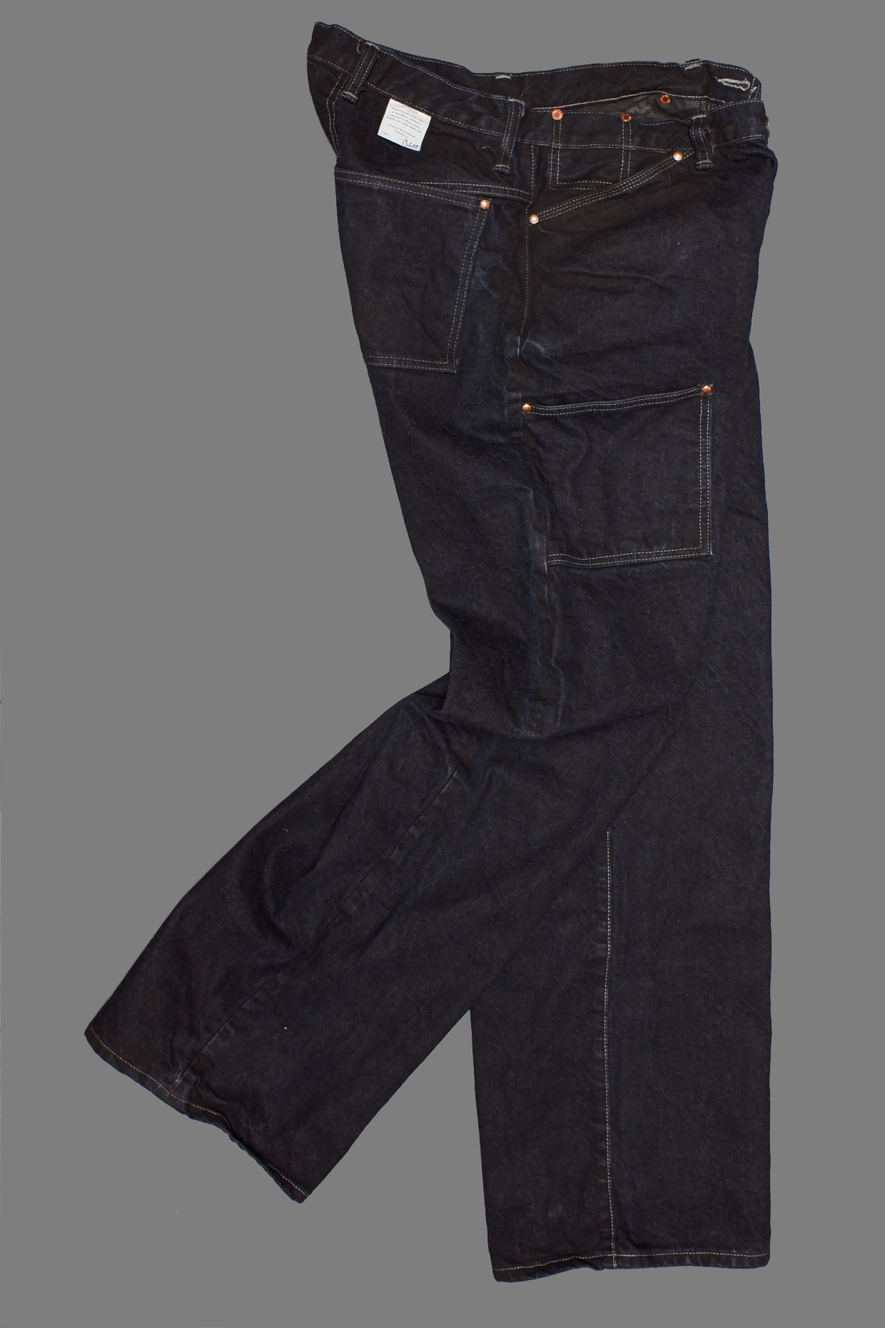 High waist extra wide jeans with a generous seat and thigh, a very roomy straight leg and an extra front thigh gardener’s pocket. This cut is inspired by the ‘Bags’ worn at Oxford University in the early 20th Century.