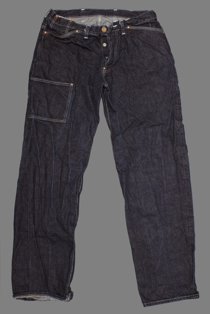 High waist extra wide jeans with a generous seat and thigh, a very roomy straight leg and an extra front thigh gardener’s pocket. This cut is inspired by the ‘Bags’ worn at Oxford University in the early 20th Century.