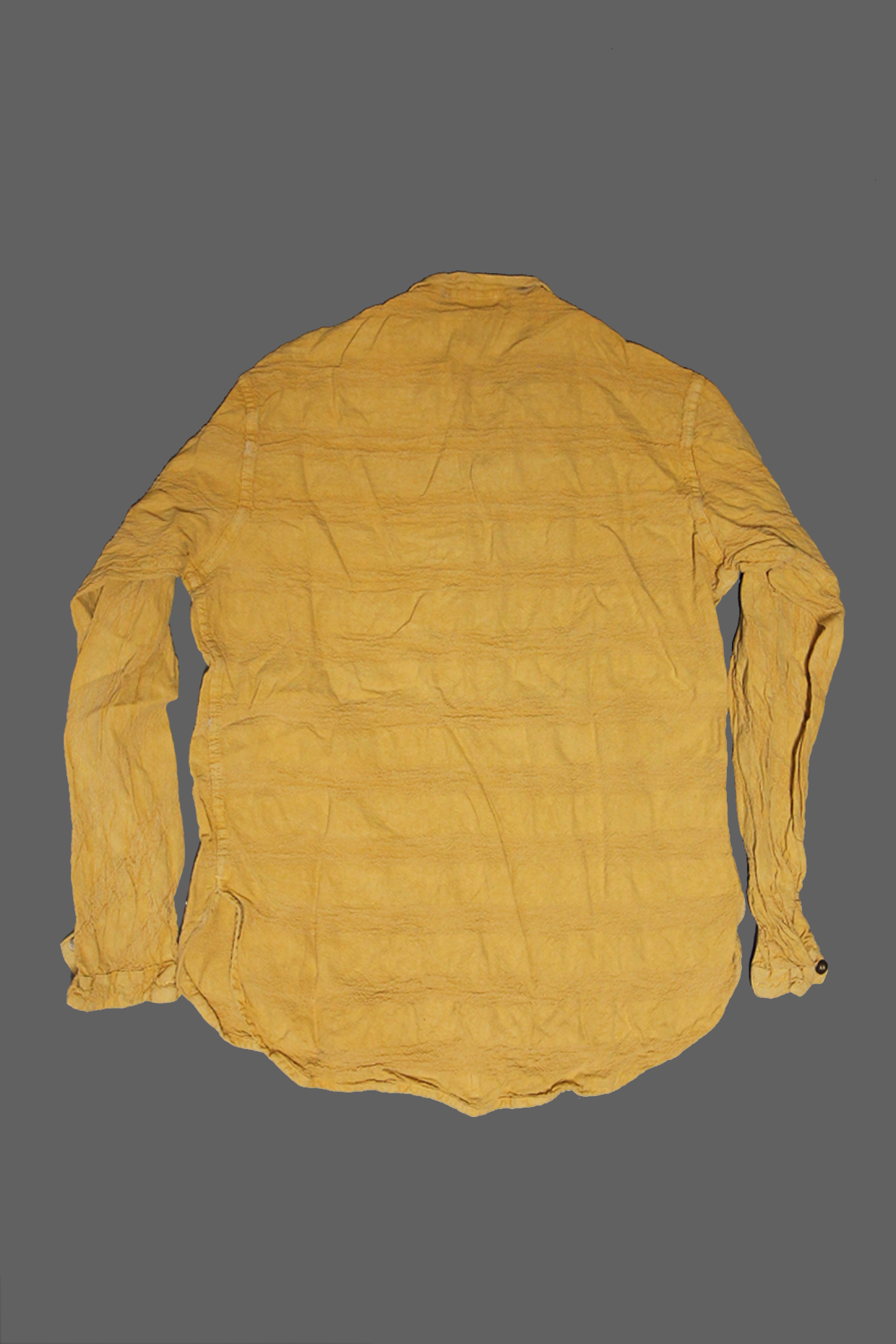 The Bound Hem Split Tail shirt’s curved tails run up into the side seam, and are bound separately, creating a sharp angled split at the sides. A pleated false cuff is cut into the sleeve seam, fastened with a shell DAKS button.