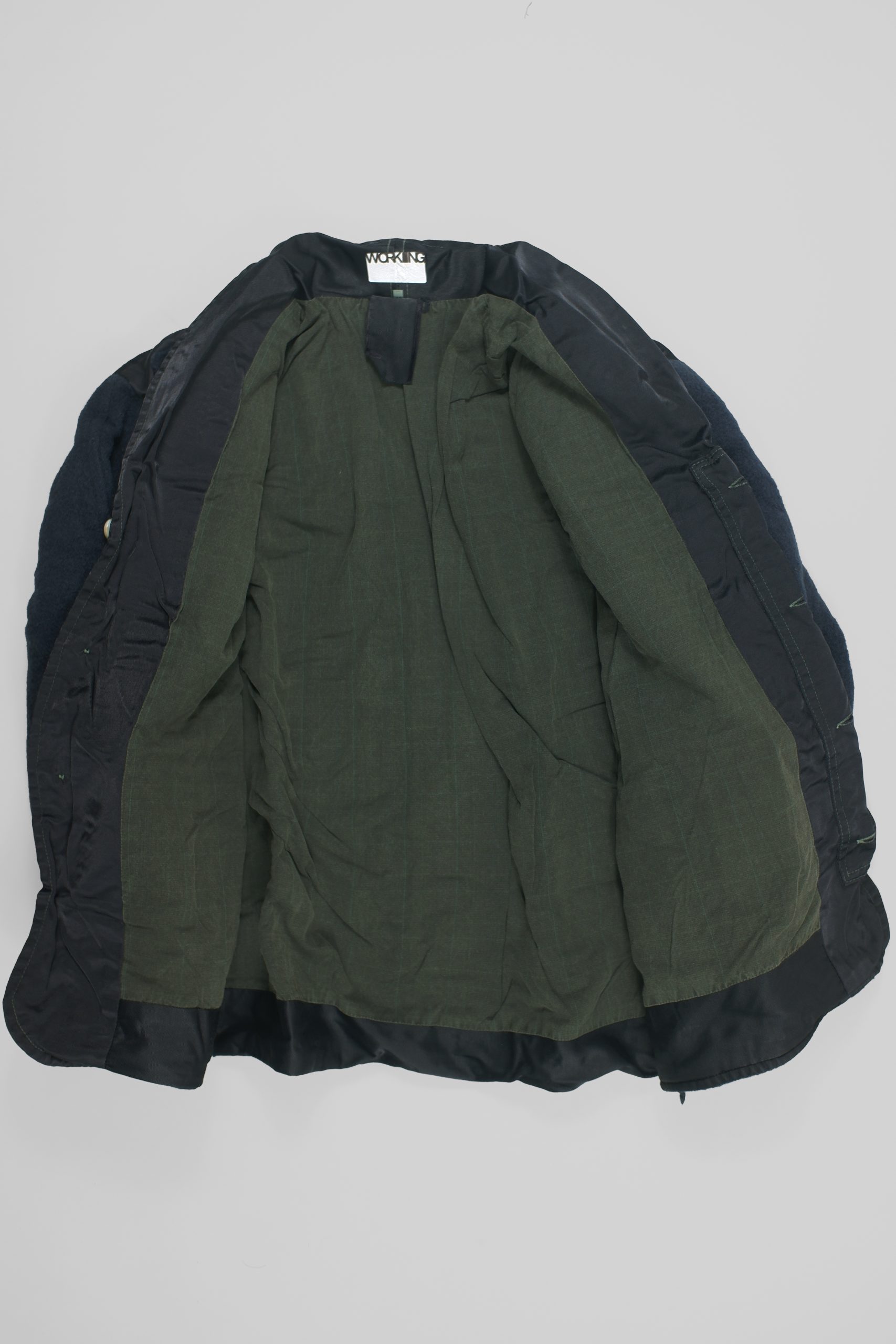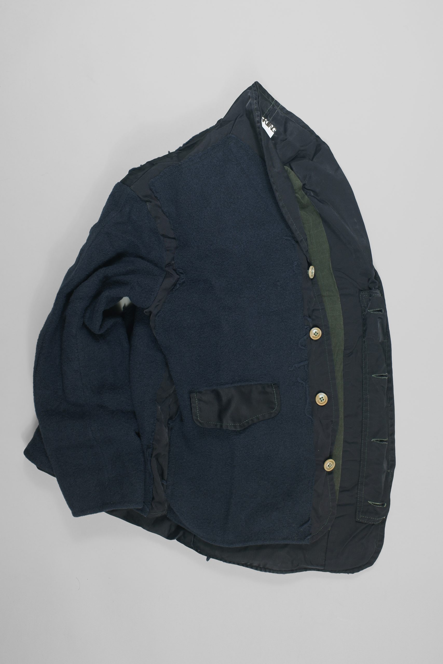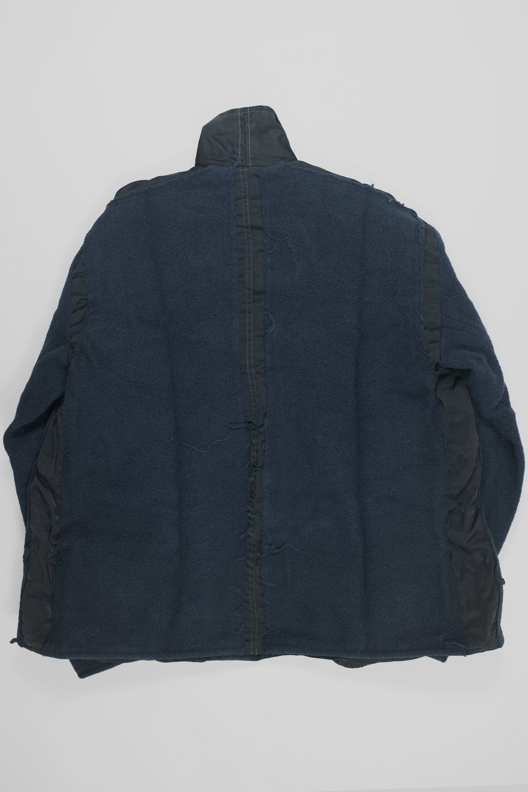 The applied panels create the warmth of three layers in the coat without adding bulk to the seams. The wool panels edges are left raw and fray out over the nylon panels, showing the construction and fabric textures.